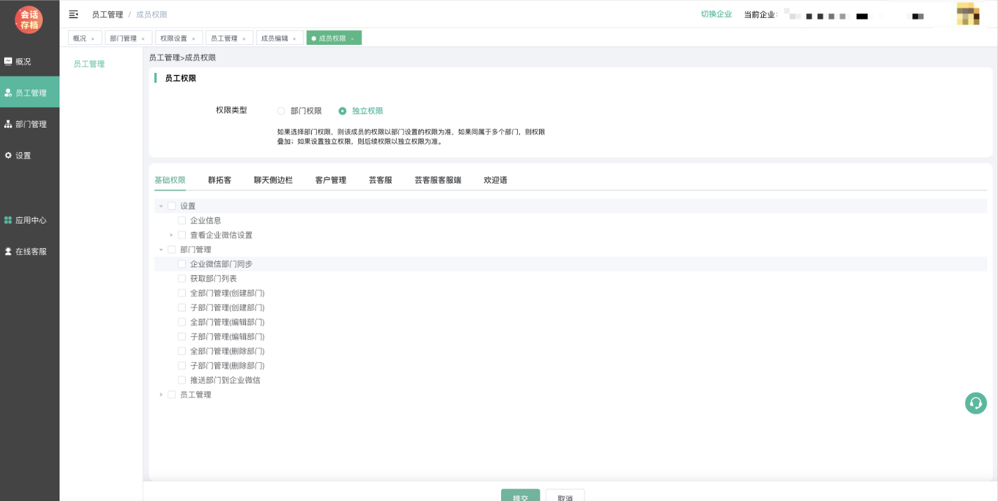 默认为部门设置的权限,如果开启并设置独立权限,则员工登录企业管理PC端所拥有的权限以独立权限设置为准。